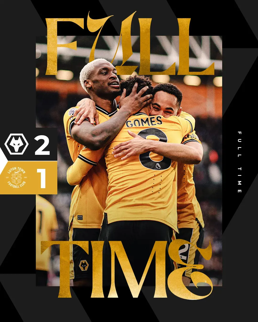在经过6分钟伤停补时后,我狼最终将2-1的比分维持到了终场哨响,黄喜灿、托蒂的进球为球队带来了久违的胜利!