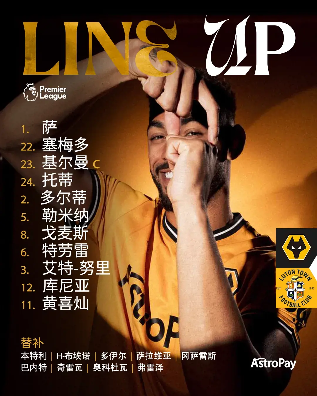 北京时间4月27日22:00,英超第35轮,我狼主场迎战卢顿。
