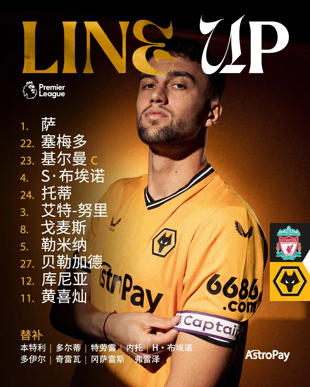 北京时间5月19日23:00,英超第38轮,我狼客场对阵利物浦。