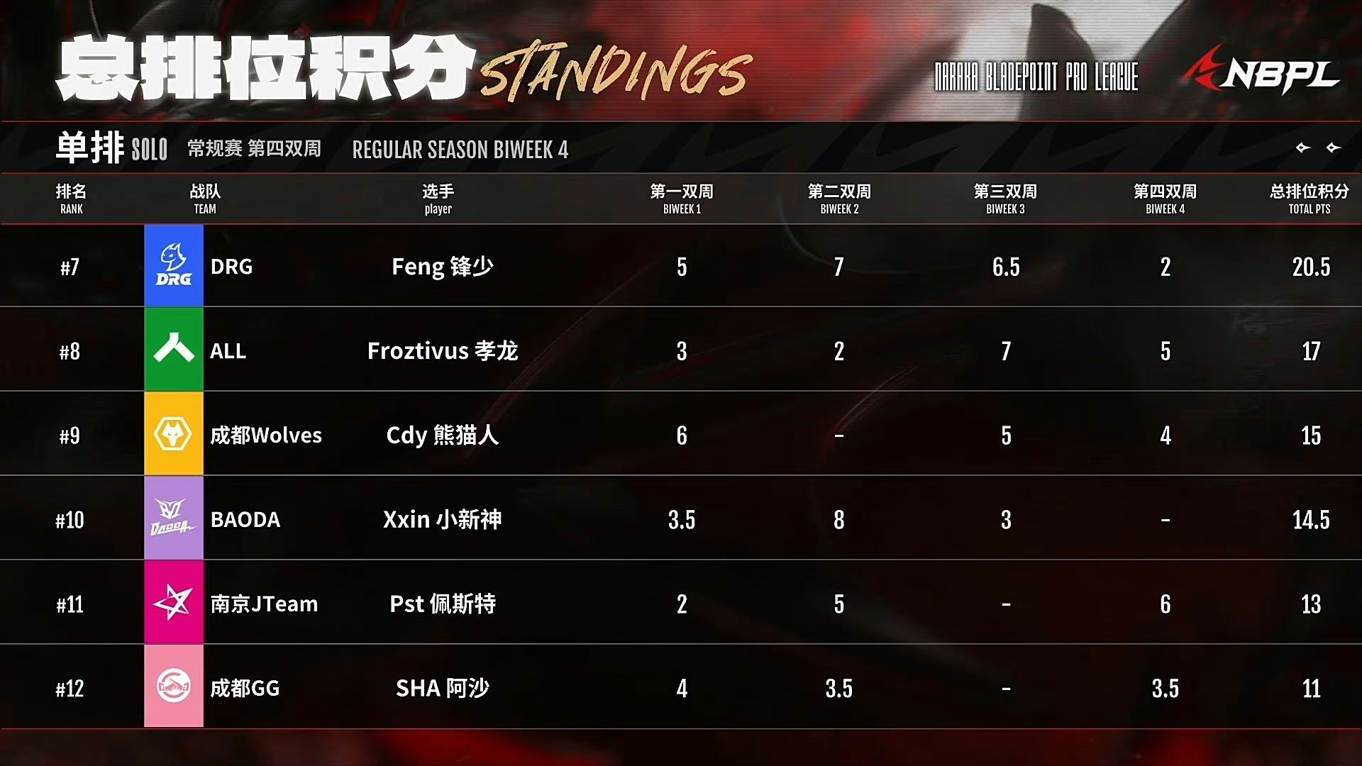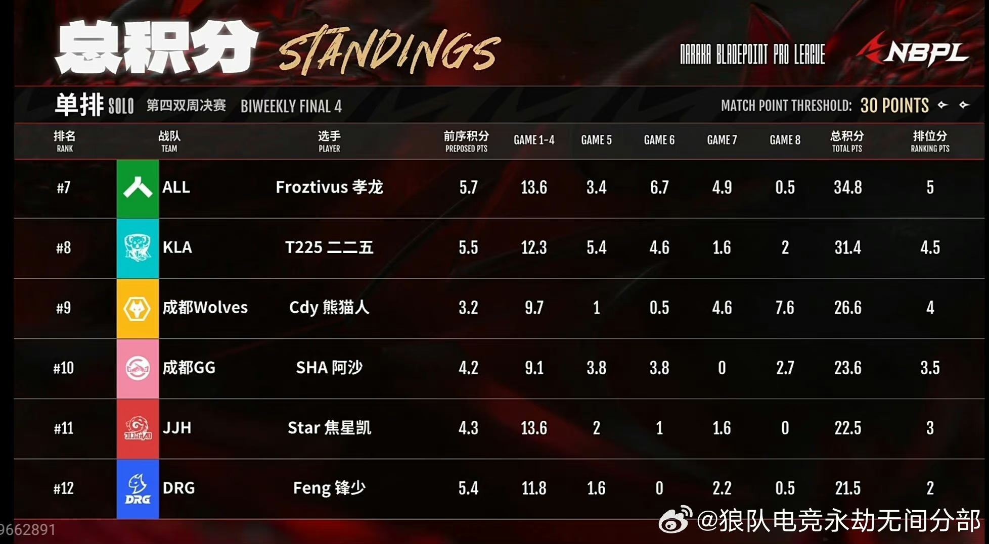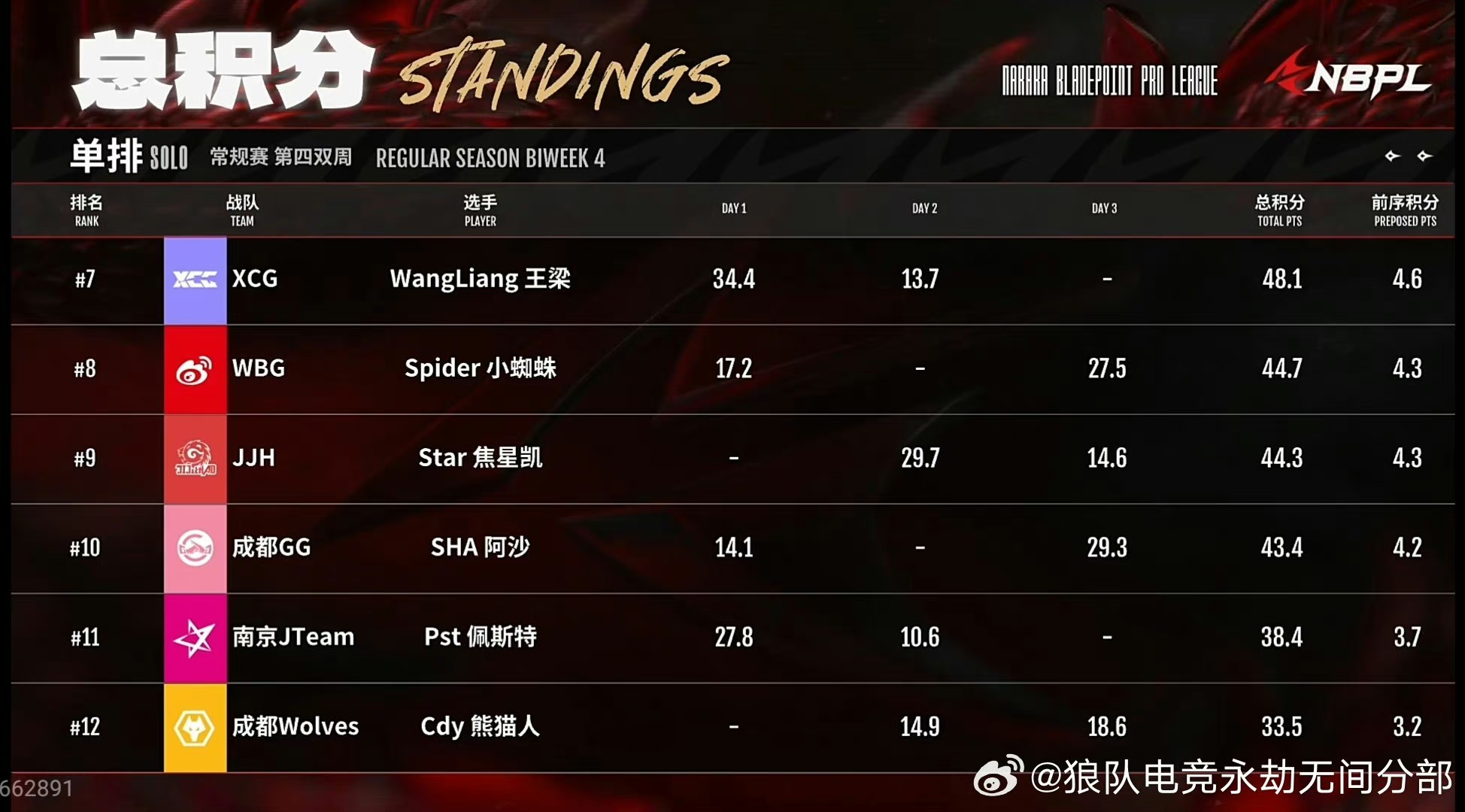 5月18日,单排周决赛,狼队Cdy熊猫人本周排名位列第9,狼队单排常规赛总排名第9,单排复活赛加油!