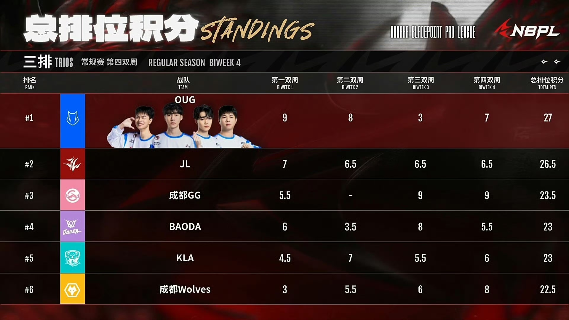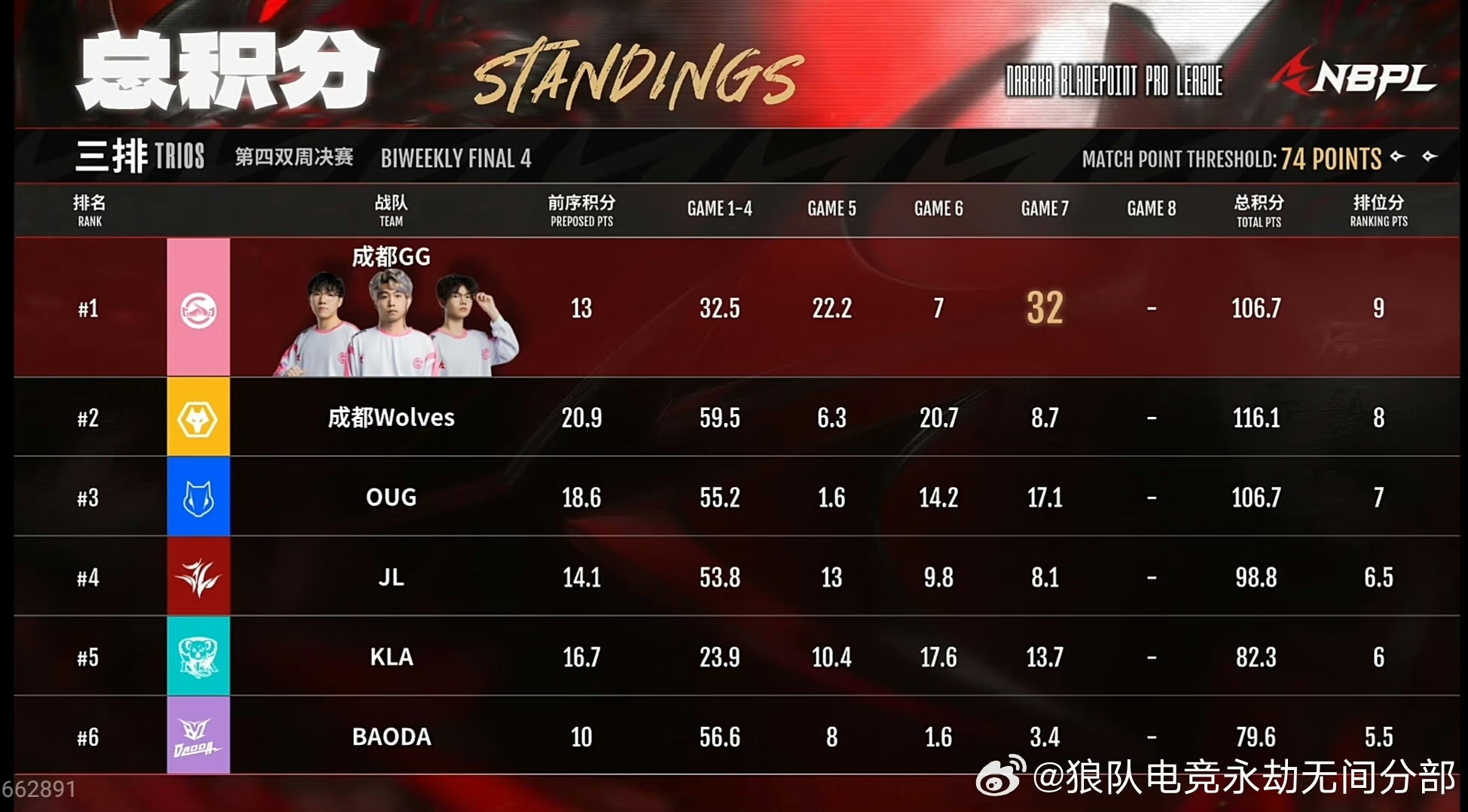 5月19日,三排周决赛,狼队以总积分116.1排名第2。常规赛总排位积分第6,直通春季赛总决赛,恭喜我们狼狼!