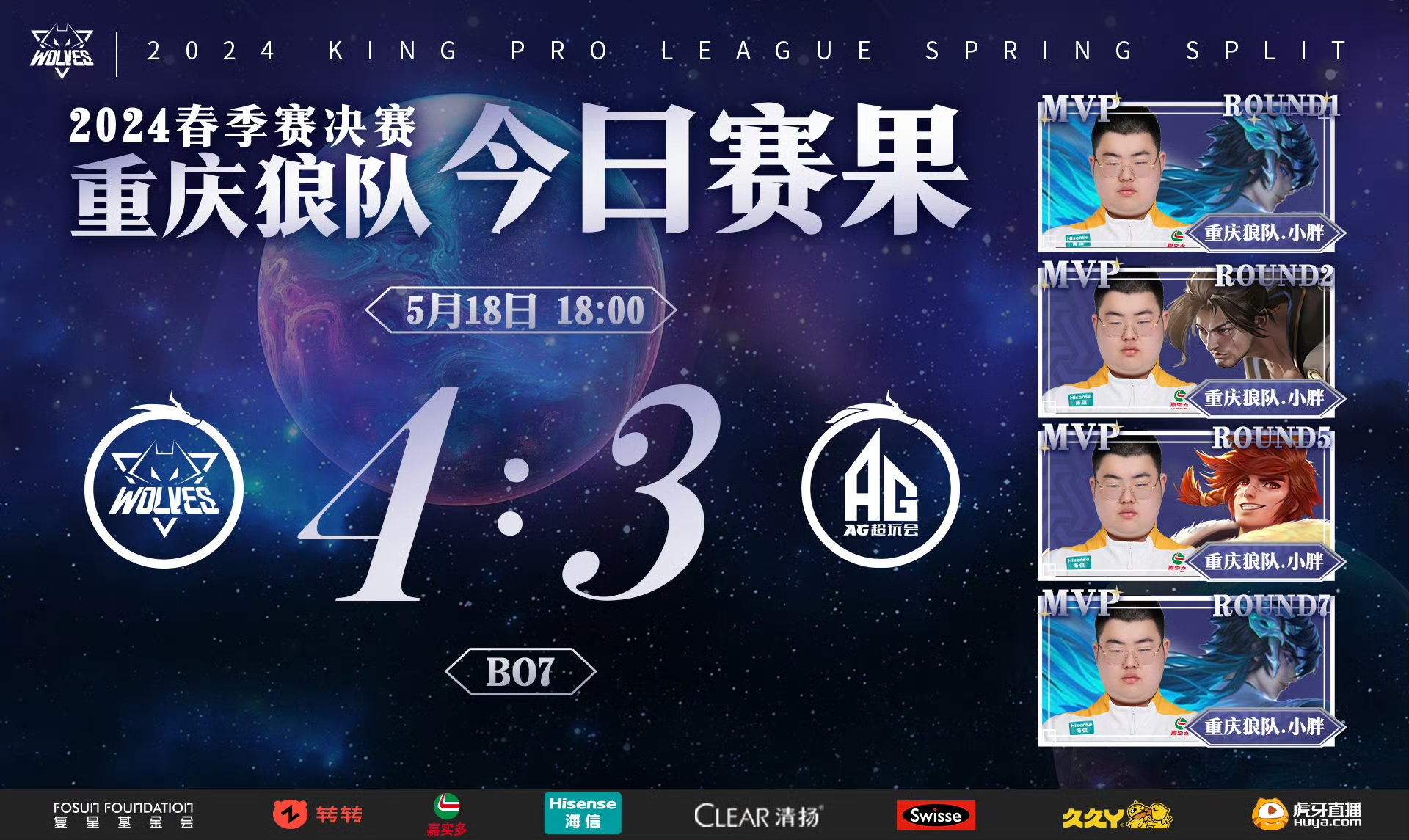 穿越逆境,直抵繁星!5月18日,重庆狼队鏖战至巅峰对决,在大连完成复仇,战胜成都AG超玩会,拿下队史第十冠!