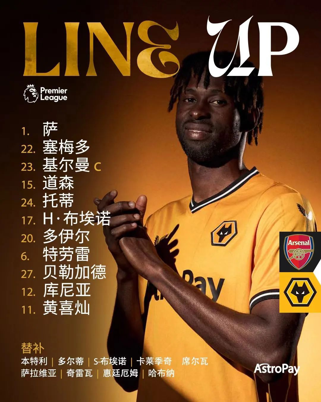 北京时间12月2日23:00,英超第14轮,我狼在客场挑战阿森纳。