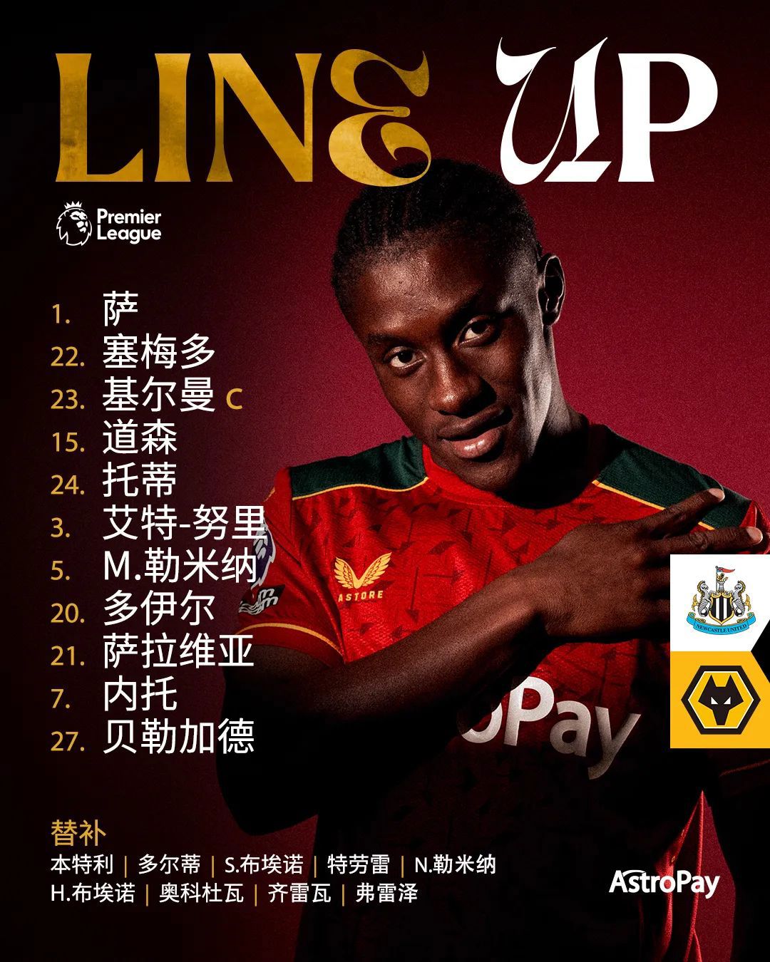 北京时间3月2日23:00,英超第27轮,我狼客场挑战纽卡斯尔联。