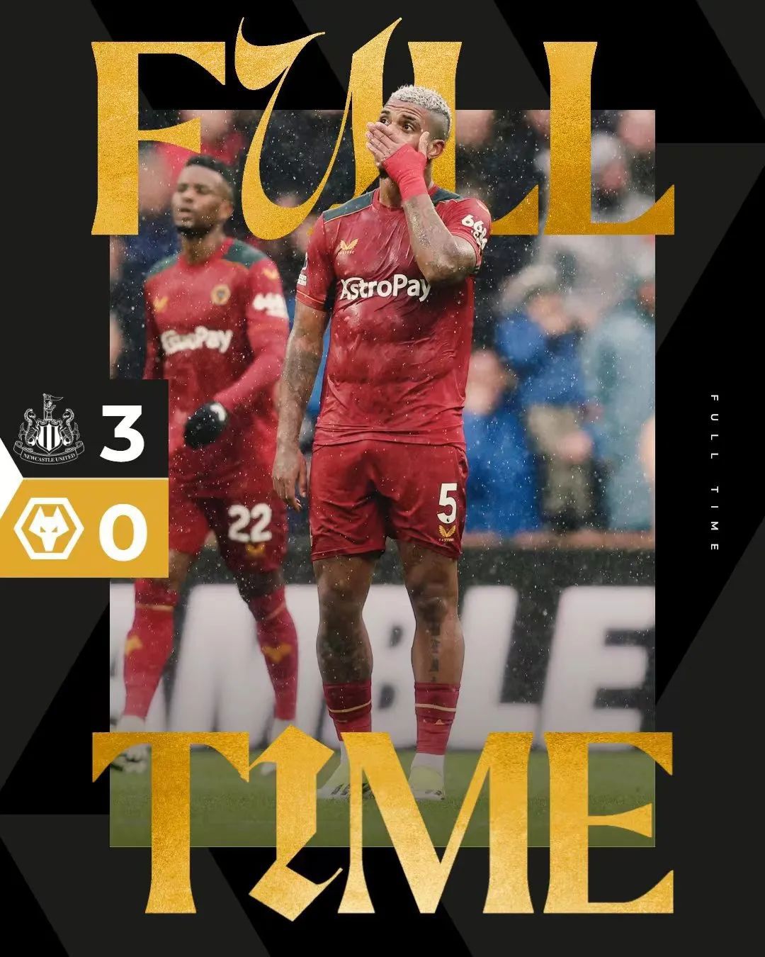 全场比赛结束,我狼在客场不敌纽卡斯尔联。