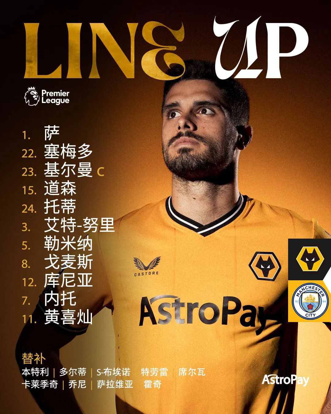 北京时间9月30日22:00,英超第7轮,我狼在主场迎来了曼城。