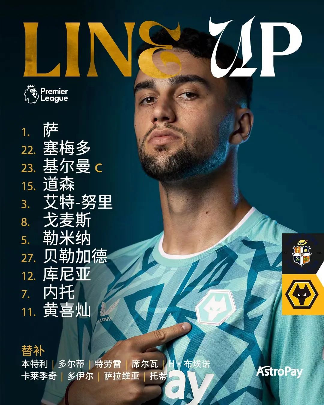 北京时间9月23日22:00,英超第6轮,狼队客场挑战卢顿。
