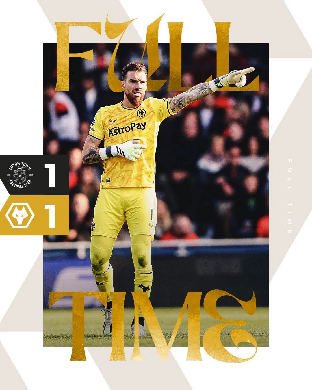 全场比赛结束,我狼在少打一人的情况下客场战平卢顿。