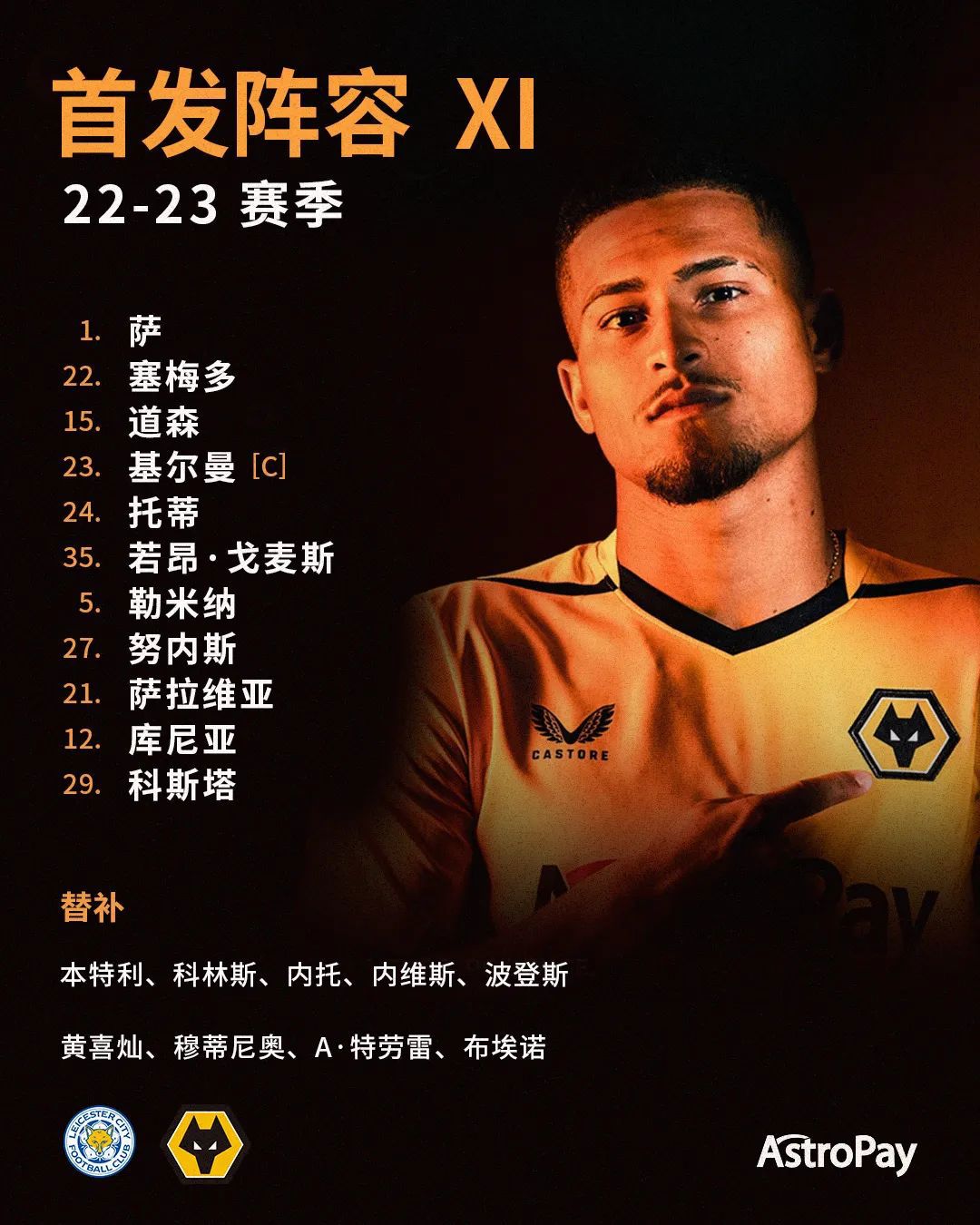北京时间4月22日22:00,英超第32轮,我狼前往客场挑战莱斯特城。