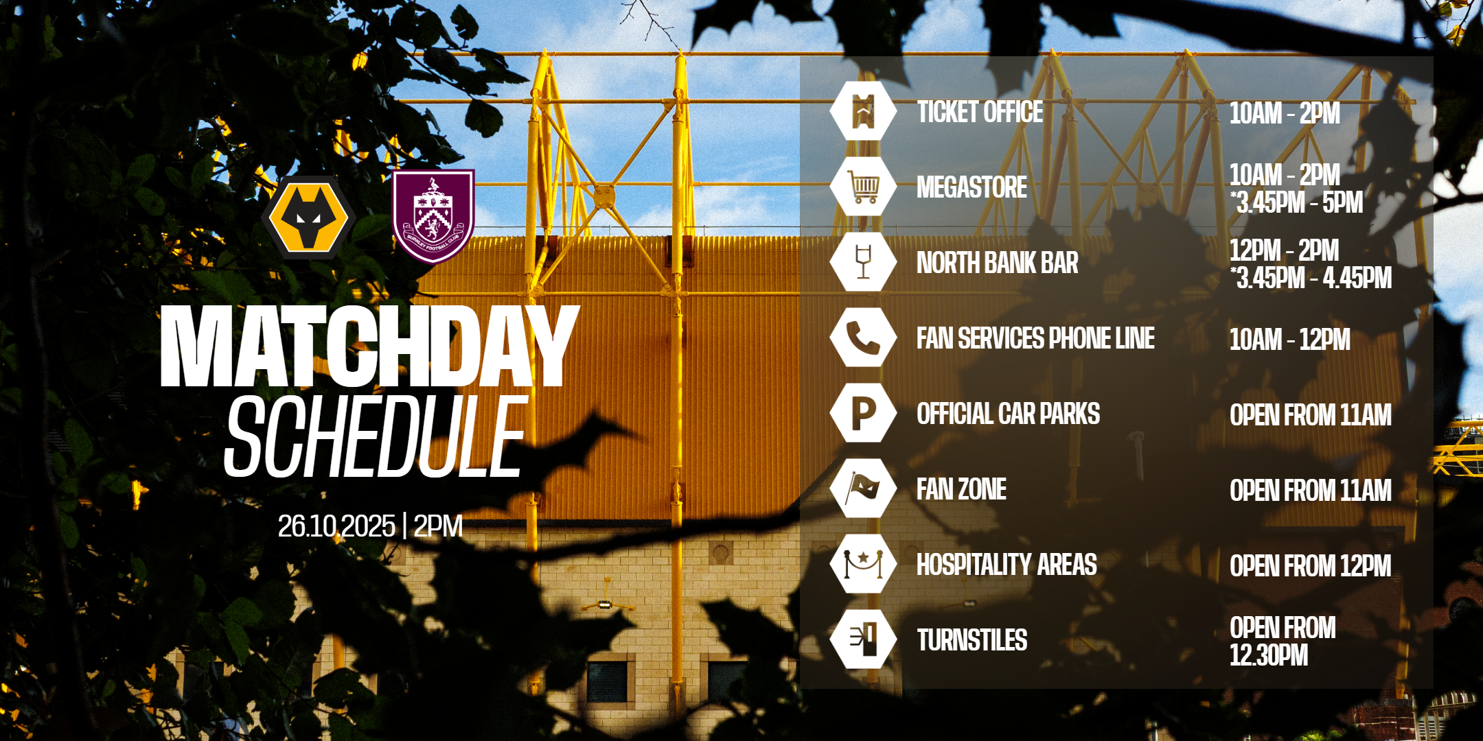Fan Services will be available from 10am on matchday by phone (01902 810 485, until 12pm) and email (fanservices@wolves.co.uk, until kick-off).