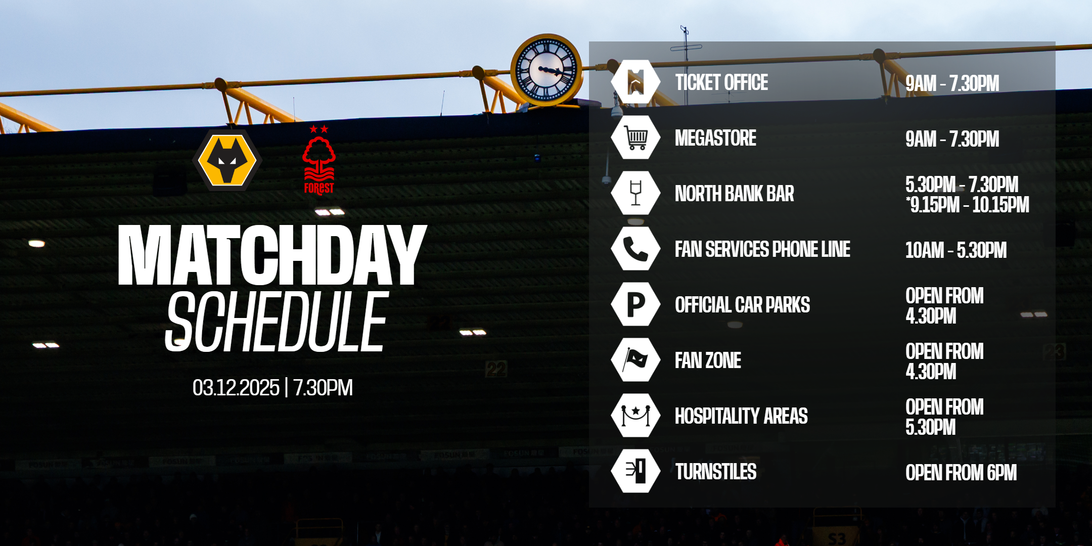 Fan Services will be available from 10am on matchday by phone (01902 810 485, until 5.30pm) and email (fanservices@wolves.co.uk, until kick-off).