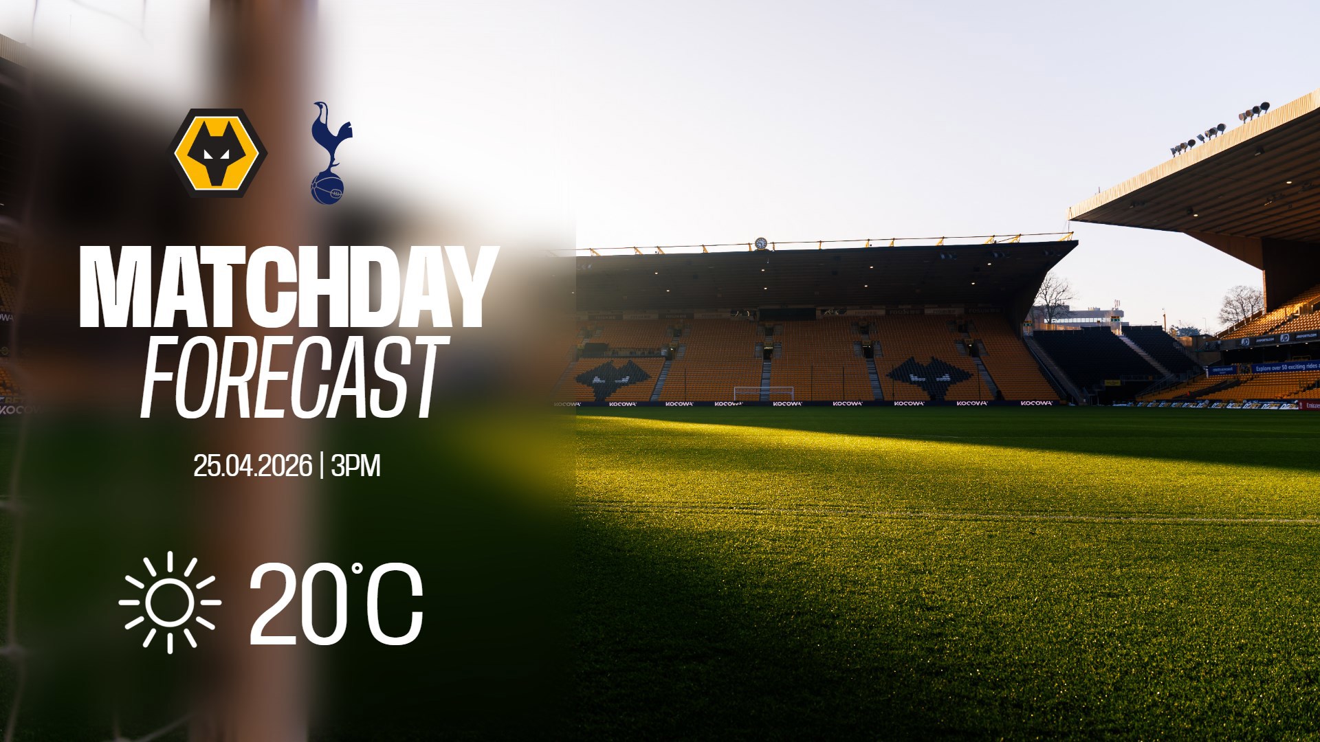 Sunny weather is forecast at Molineux on Saturday afternoon, with temperatures expected to be around 20 degrees Celsius at the time of kick-off.